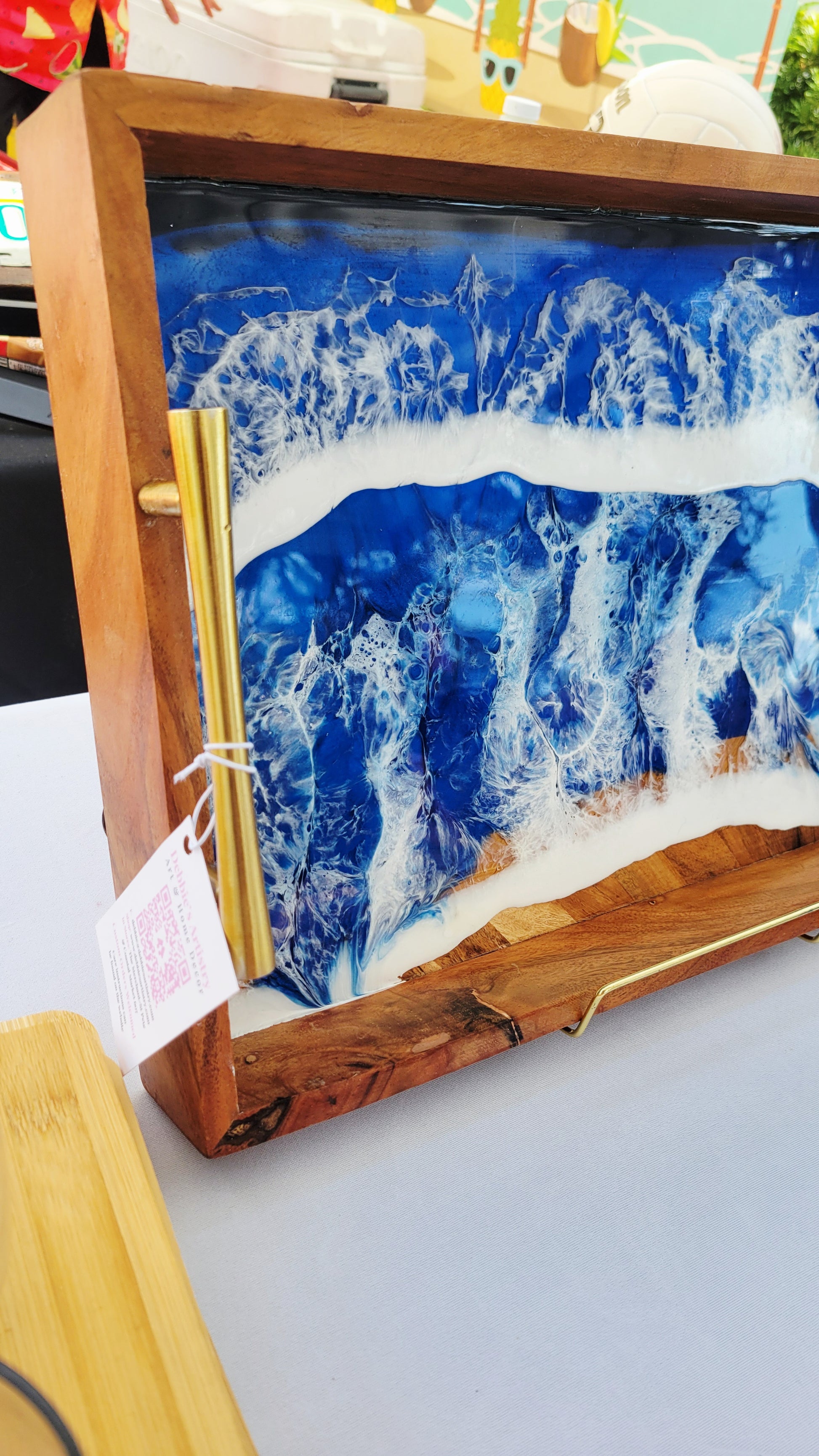 Blue Ocean Style Serving Tray. Add a touch of elegance to any space with this acacia wood serving tray. This tray offers an eye-catching blend of natural and modern elements. Made with non-toxic resin, making it a sustainable option for your needs.